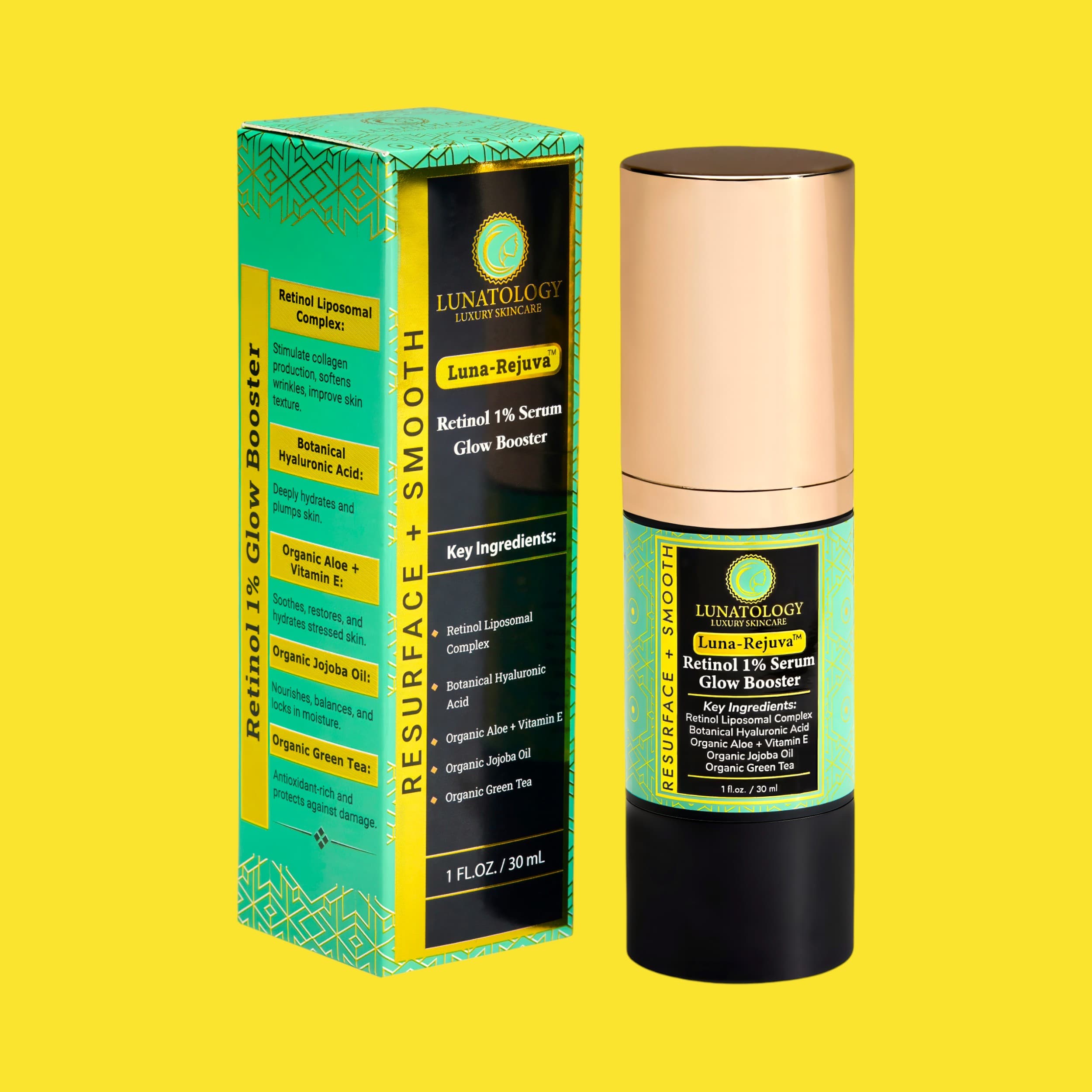 Retinol stimulates collagen production, boosts cell turnover, and refines texture to reduce fine lines, wrinkles, and pores. Hyaluronic Acid plumps and hydrates, while Aloe, Jojoba, and Vitamin E soothe and nourish. Green Tea provides antioxidant protection, helping skin appear smoother, brighter, and more even-toned over time.