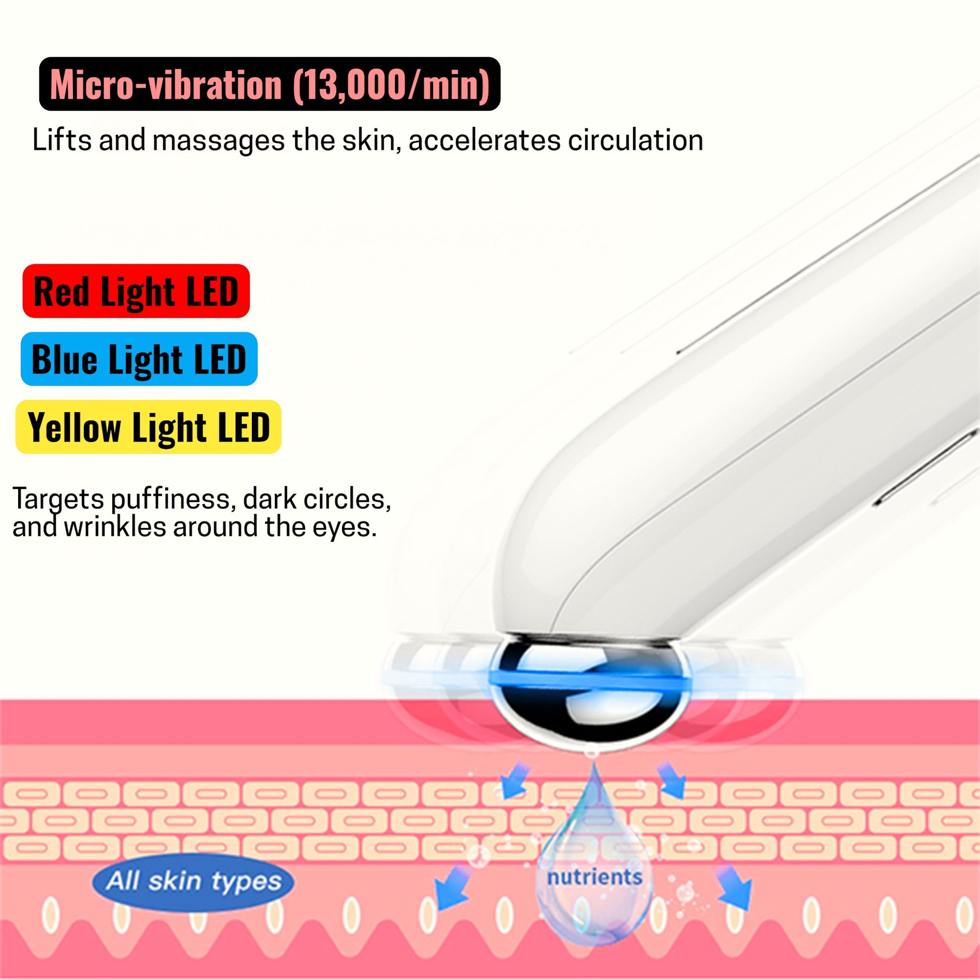 Reduce Puffiness & Eye Bags: Micro-vibration (13,000/min) and blue LED light calm and soothe under-eye puffiness.